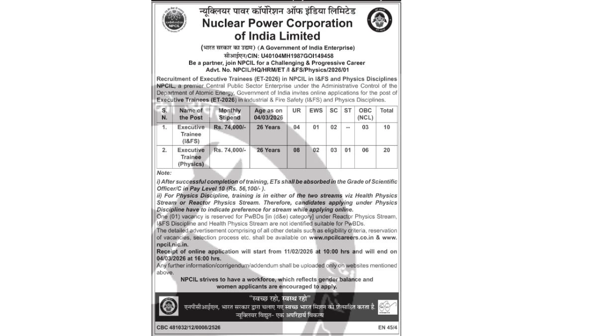 NPCIL Executive Trainee Recruitment 2026 notification has been released by the Nuclear Power Corporation of India Limited (NPCIL) for 30 Executive Trainee (ET-2026) posts in Industrial & Fire Safety and Physics disciplines.