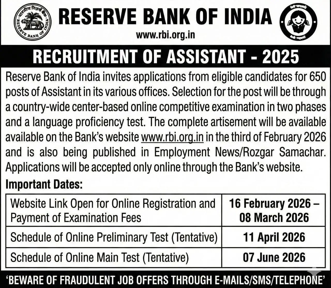 RBI Assistant Recruitment 2026 is officially announced for 650 Assistant posts. Fresh graduates with any degree can apply online from 16 February 2026 to 08 March 2026 through the RBI official website www.rbi.org.in.
