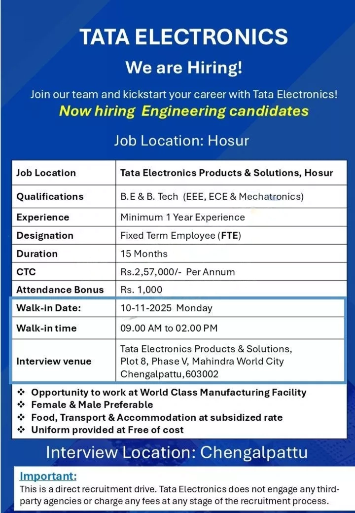 Tata Electronics Walk-in Drive | Engineers | BE/ B.Tech – EEE/ ECE/ Mechatronics | Hosur | Interview Location: Chengalpattu | Walk-In Date: 10th November 2025